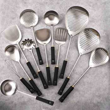All'ingrosso suso304 in acciaio inossidabile in silicone Set di utensili da cucina con manico di colore nero spatola cucchiaio forato di pepe