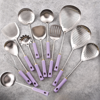 Commercio all'ingrosso SUS304 in acciaio inossidabile Set di stoviglie viola manico utensili da cucina spatola pepe cucchiaio forato