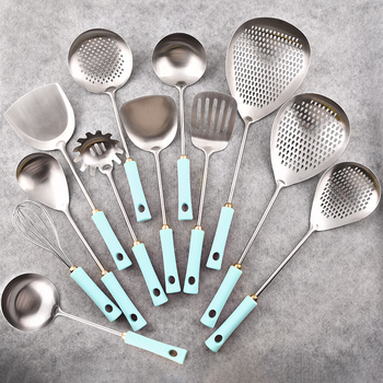 Commercio all'ingrosso SUS304 in acciaio inossidabile Set di stoviglie blu manico utensili da cucina spatola pepe cucchiaio forato