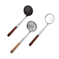 Mestolo di 304 in acciaio inox all'ingrosso con manico in legno filo Skimmer e rete filtro olio scanalato